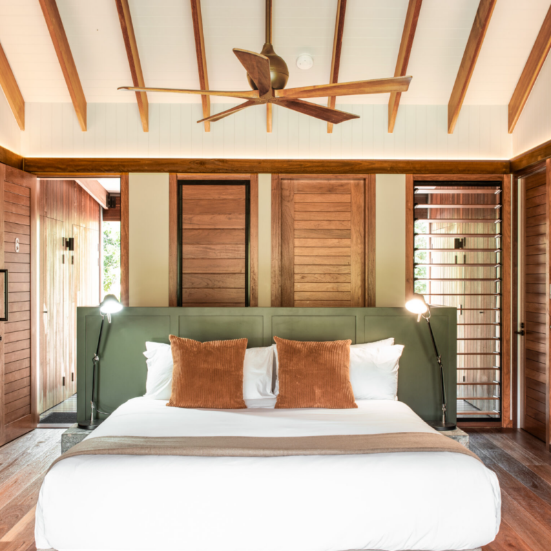 The Pavilion’s design features three bedrooms connected by an internal corridor and offering either king or twin bed configurations. Each bedroom boasts a luxurious ensuite bathroom with dark grey stone tiles and sleek bronze fittings, exuding an air of calm and sophistication. The central bedroom includes a cosy wood-burning fireplace, creating a warm, inviting atmosphere.Each bedroom enjoys direct access to the private verandah, with two featuring a custom-designed deep outdoor bath crafted from corrugated iron, providing guests a unique opportunity to unwind while taking in uninterrupted views of the vast outback landscape.